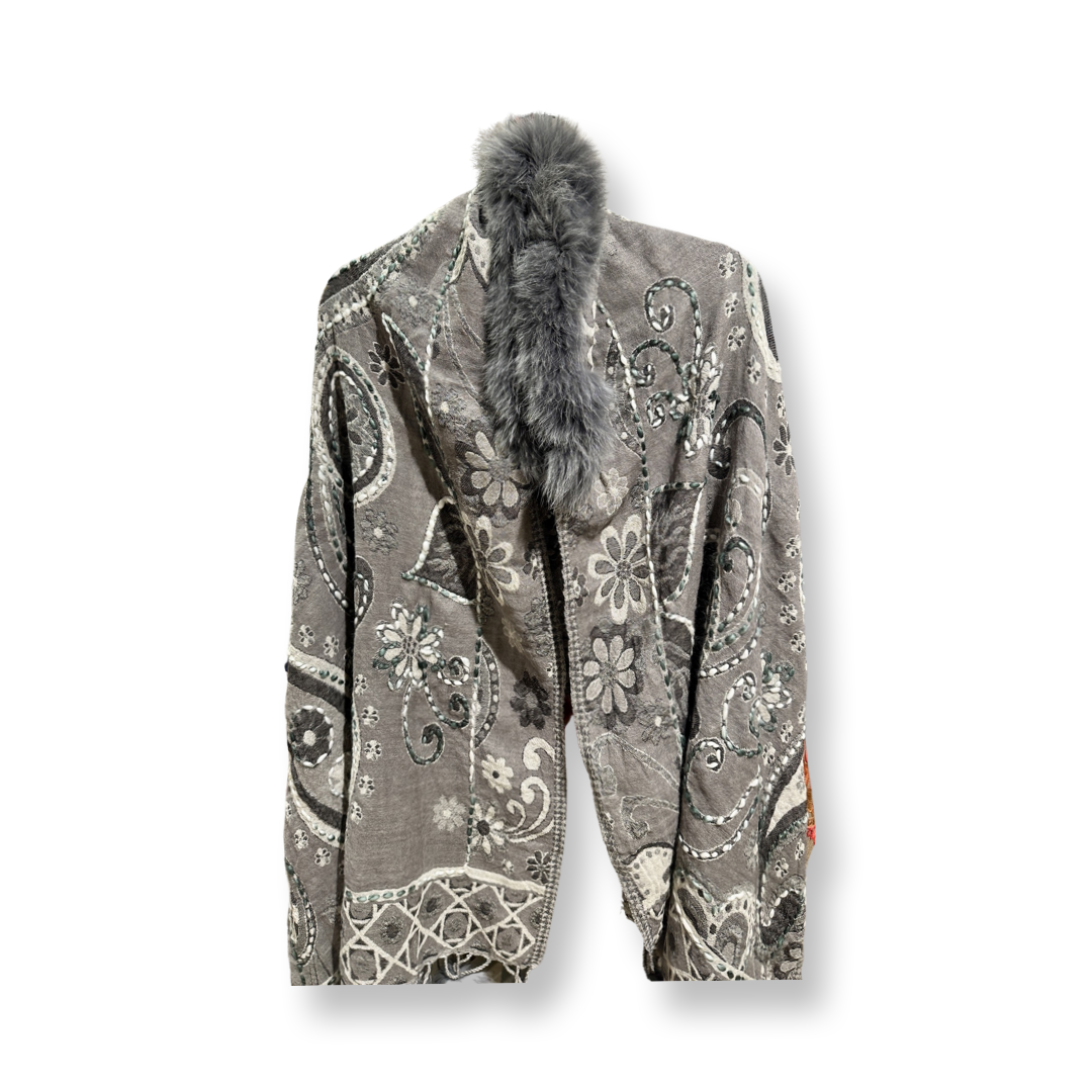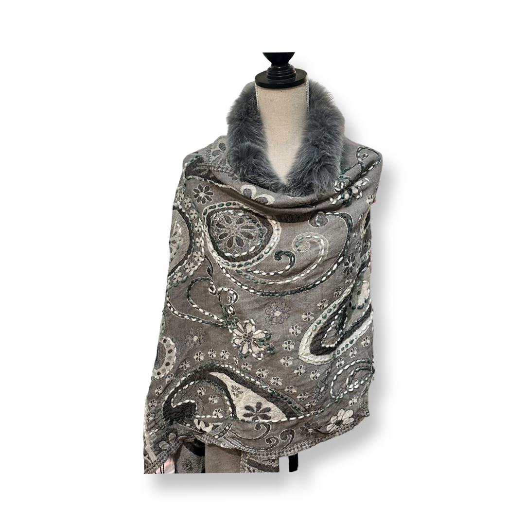 These exquisitely embroidered wool shawls are a harmonious blend of traditional craftsmanship and modern design. Featuring subtle yet vibrant multicolor tones, each piece is expertly designed by skilled artisans using intricate jacquard weaving techniques layered in complementary hues. Accented with recycled fox fur on the collar and playful pom-poms add a touch of luxe and sustainability. Perfect as a stole, wrap, or statement shawl for both everyday elegance and festive occasions