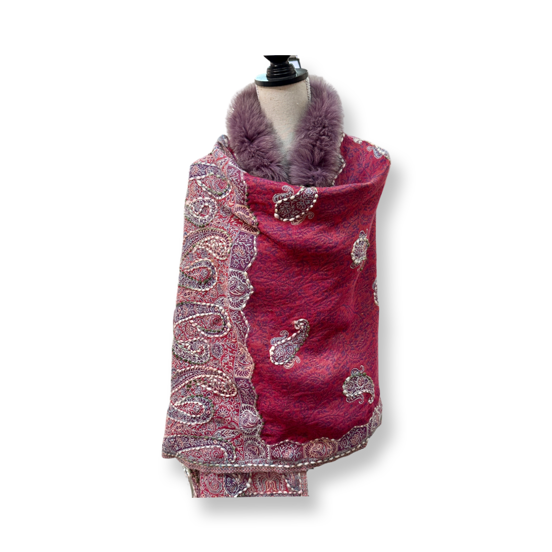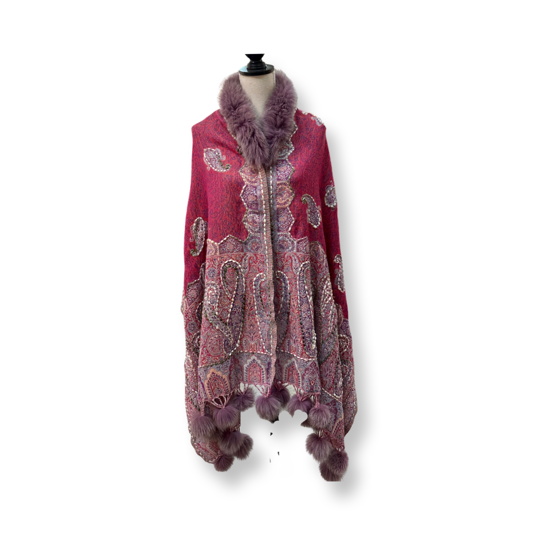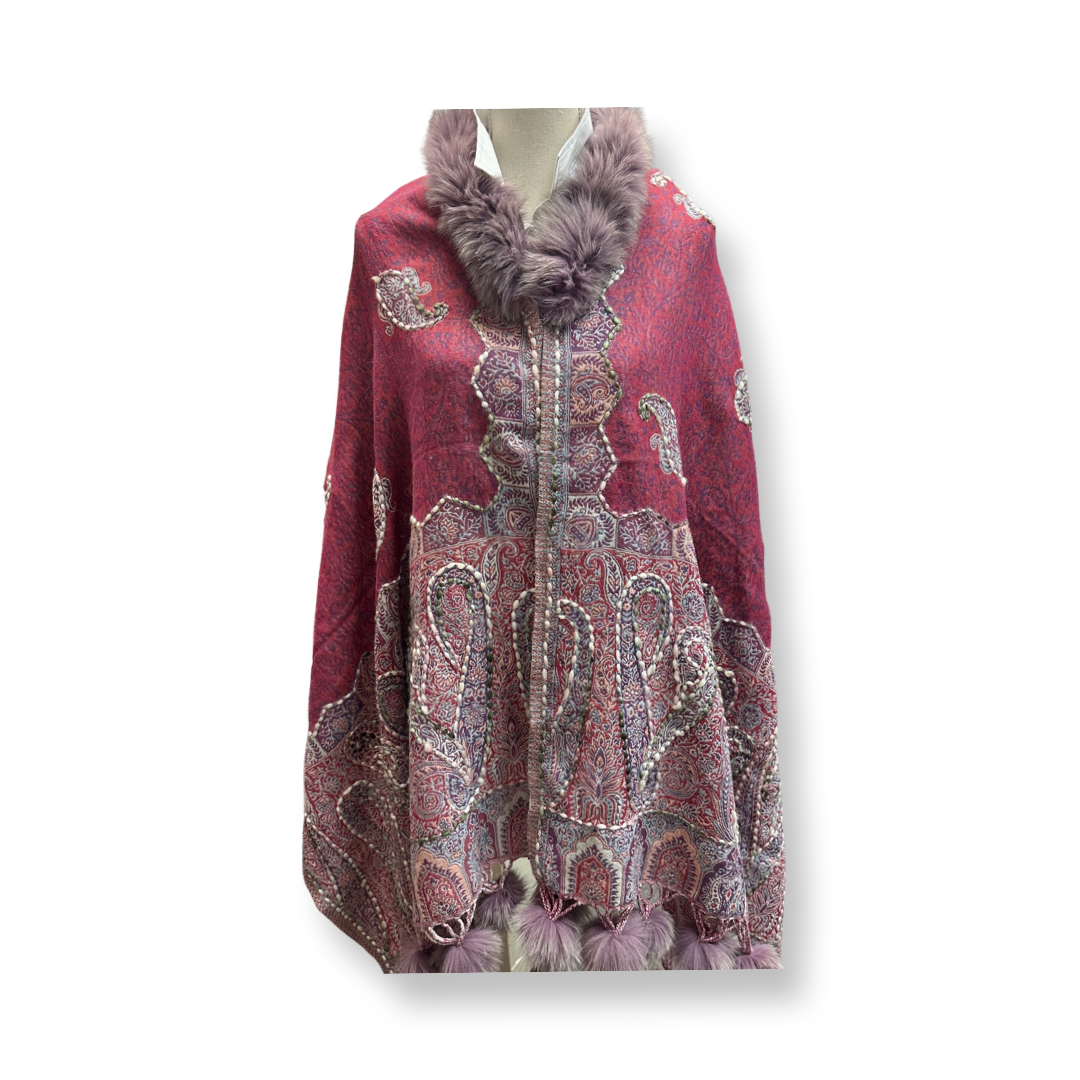 These exquisitely embroidered wool shawls are a harmonious blend of traditional craftsmanship and modern design. Featuring subtle yet vibrant multicolor tones, each piece is expertly designed by skilled artisans using intricate jacquard weaving techniques layered in complementary hues. Accented with recycled fox fur on the collar and playful pom-poms add a touch of luxe and sustainability. Perfect as a stole, wrap, or statement shawl for both everyday elegance and festive occasions